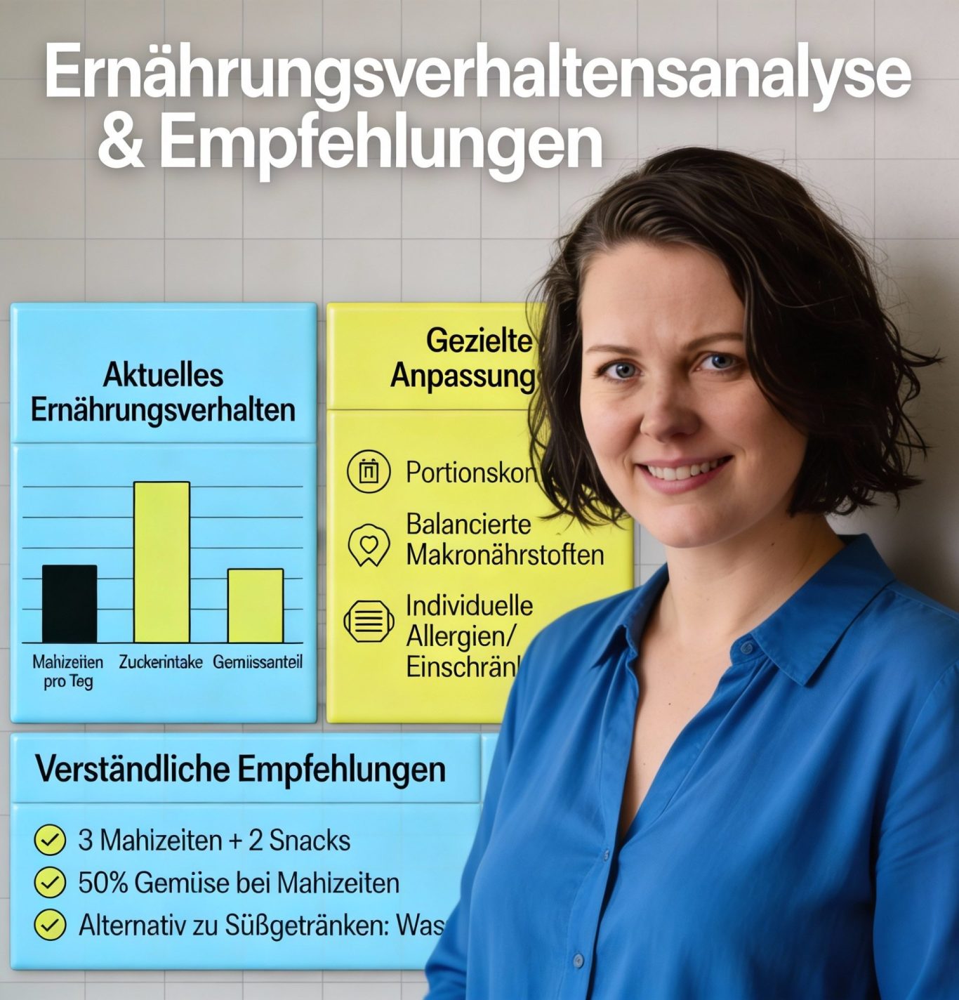 - Die Auswertung ermöglicht es uns, Anpassungen vorzunehmen und Rückschlüsse auf Dein bisheriges Ernährungsverhalten zu ziehen. So können wir gemeinsam Deine Ernährung gezielt verbessern. Hier bei lassen wir deine Ernährungswünsche mit einfließen.